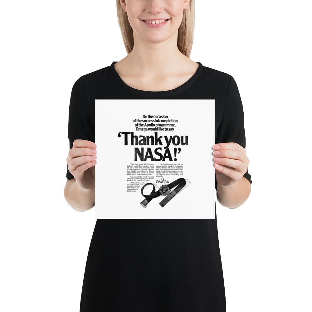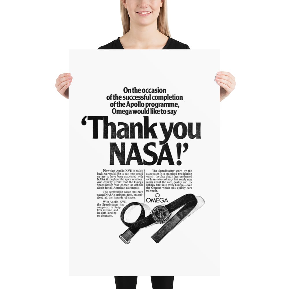 This poster is a reproduction of an advertisement for the Omega Speedmaster watch dates from the early 1970s, specifically published around the time the Apollo program concluded in December 1972 with the Apollo XVII mission. The ad serves as a "thank you" from Omega to NASA, leveraging the immense public interest in the space program to highlight the watch's reliability and quality. NASA had previously selected the Speedmaster as the official watch for all American astronauts after a series of stringent tests, a major point of pride and a highly effective marketing tool for Omega. The ad emphasizes that the watch worn by astronauts was a standard production model, linking the everyday consumer to the historic achievement of space exploration. The advertisement campaign for Omega, along with other brands associated with the missions, was highly successful in using the cultural significance of the moon landings to boost brand reputation.