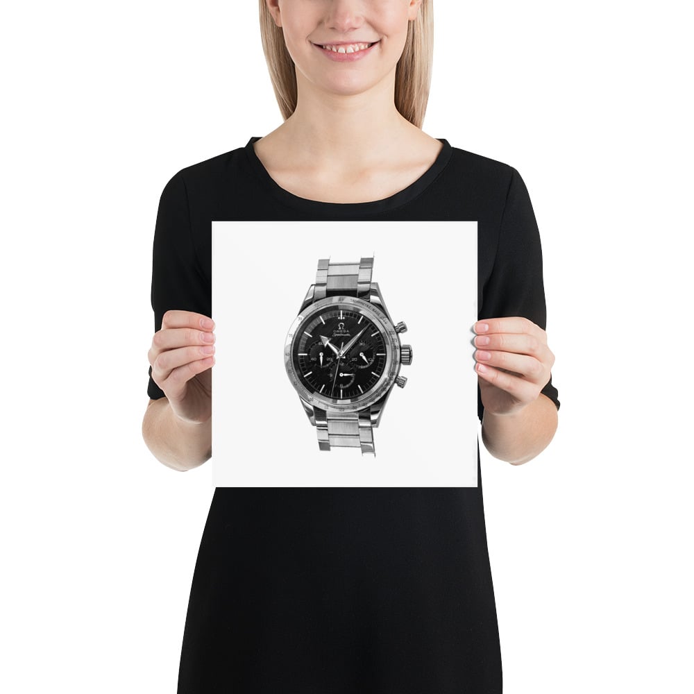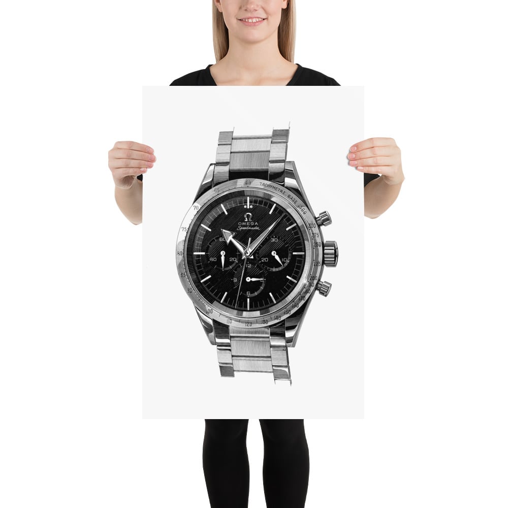 This poster is a reproduction of an official illustration of the Omega Speedmaster reference 2915-1, launched in 1957, is the highly coveted first iteration of the legendary Speedmaster line, originally designed as a robust chronograph for automobile racing. It was a key part of a professional watch trilogy that also included the Seamaster 300 and the Railmaster. This initial model, produced only for a short time (1957-1958), is highly sought after by collectors due to its unique features that later changed, such as the distinctive large stainless steel "broad arrow" hands and a stainless steel bezel with an engraved tachymeter scale (rather than a black aluminum insert). It housed the renowned manual-winding Calibre 321 column-wheel movement, known for its precision and reliability, a movement that would famously power the watches worn during the first moon landing years later. The 2915-1's innovative design, with the tachymeter on the external bezel for better legibility, laid the foundation for the future "Moonwatch" and established the Speedmaster as an icon in horological history.