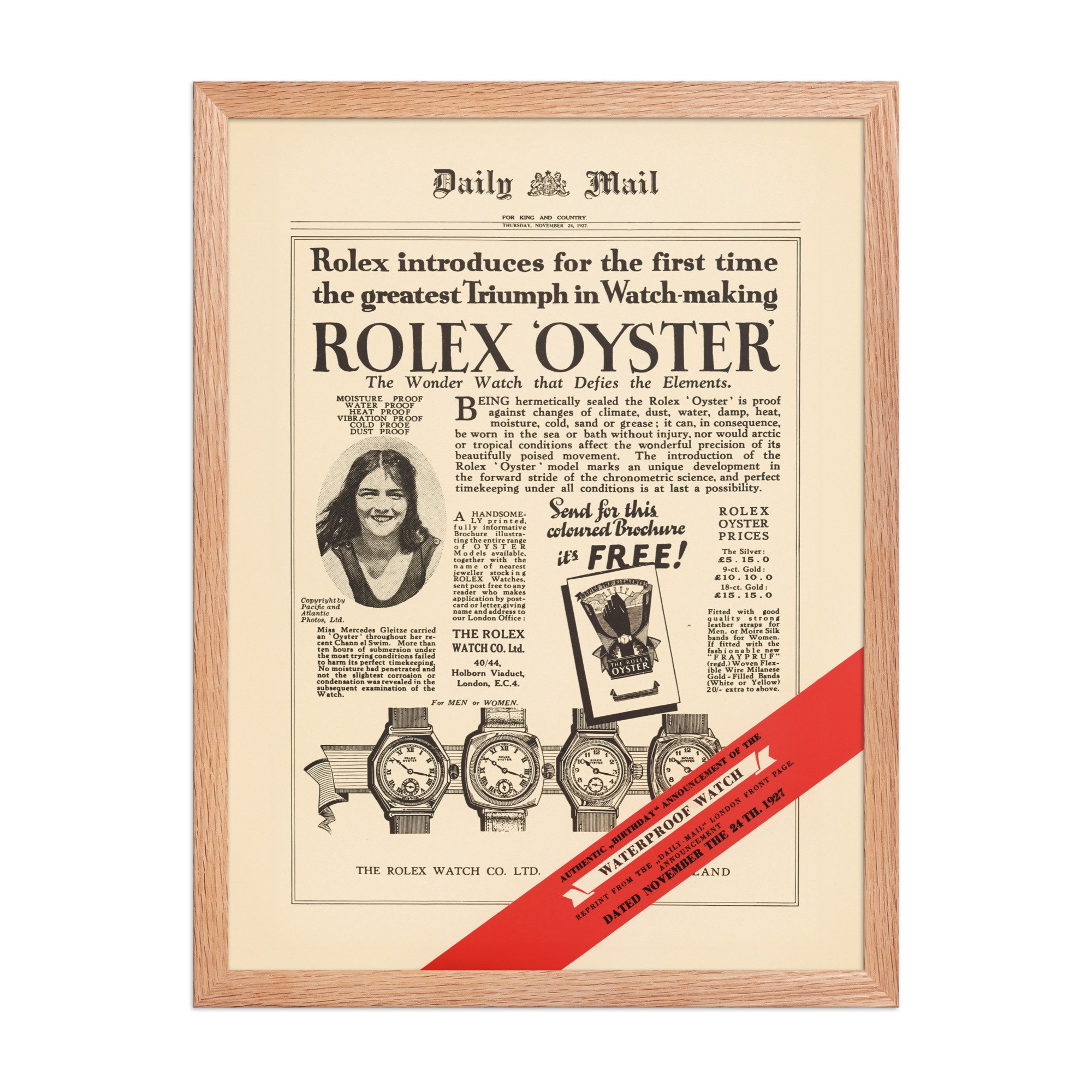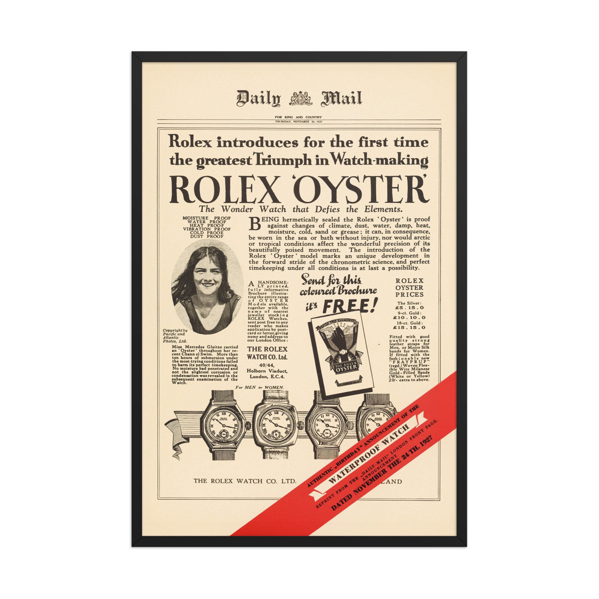 This poster is a reprint of the famous full-page Rolex advertisement that ran on the front page of the London Daily Mail on November 24, 1927. The advertisement publicly celebrated the success of the newly introduced Rolex Oyster, the world's first practical waterproof wristwatch. Rolex founder Hans Wilsdorf had provided the watch to young British swimmer Mercedes Gleitze, who wore it around her neck during her highly publicized "vindication swim" across the English Channel after a rival's false claim had cast doubt on her original record-breaking swim. Although she had to abandon the second attempt due to the cold water, the watch remained in perfect working order, demonstrating its durability and leading to this iconic marketing campaign. The event marked the birth of the "testimonee" concept, where real-world achievements by athletes and adventurers were used to prove a product's performance, a strategy Rolex still employs today.